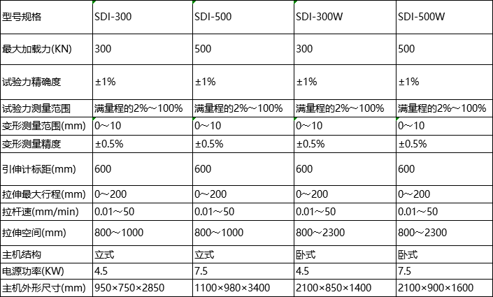 主機(jī)為四立柱或雙立柱剛性框架,有立式和臥式兩種機(jī)型,絲杠調(diào)節(jié)拉頭移動(dòng),加載速度無(wú)級(jí)設(shè)定。
